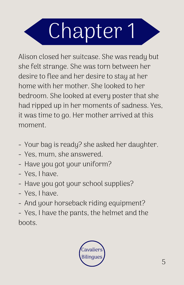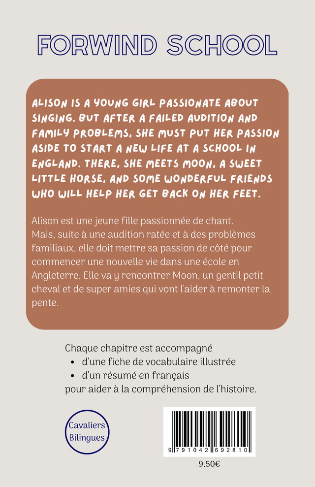 Ce roman anglais-équitation, accessible dès le collège, va transporter votre enfant dans une histoire d’amitiés et de chevaux. Sans s’en rendre compte, il va travailler son anglais et apprendre du vocabulaire équestre en anglais. Pas d’exercices ou de leçons, juste le plaisir de la lecture. Les fiches de vocabulaire illustrées et les résumés en français à chaque chapitre sont là pour l’aider dans la compréhension de l’histoire.