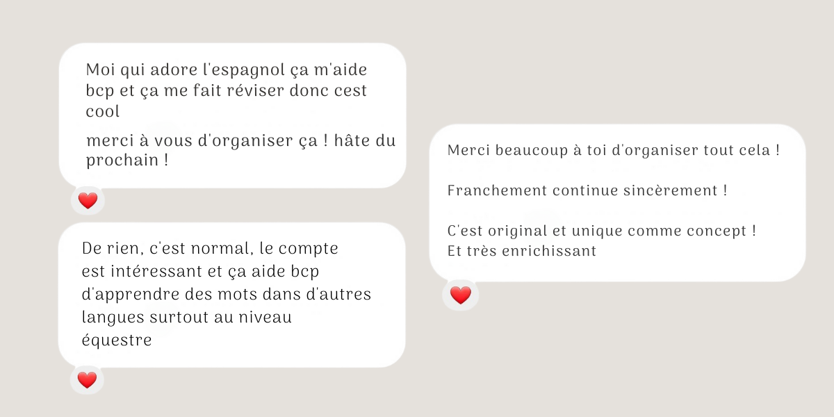 Suite à l’obtention de mon bac, j’ai développé d’autres projets sur ce thème-là. Puis, en février 2020, j’ai créé les activités Cavaliers Bilingues. Il s’agit de petites activités sur Instagram permettant d’apprendre du vocabulaire équestre en anglais et en espagnol.