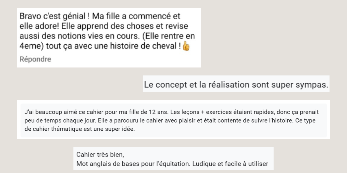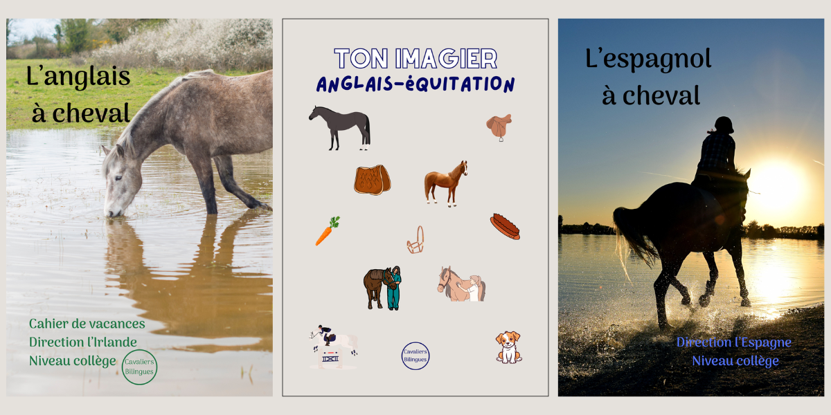 En mars 2024, suite à mon inscription pour exposer au Salon du cheval de Paris, en décembre, je décide de retourner vers mon projet initial, celui dont j’ai eu l’idée en 2020. Je me lance dans la création de mon premier cahier de vacances anglais-équitation “Direction l’Irlande”, niveau collège. Il sort en juin 2024. À l’automne 2024, deux nouveaux cahiers voient le jour :